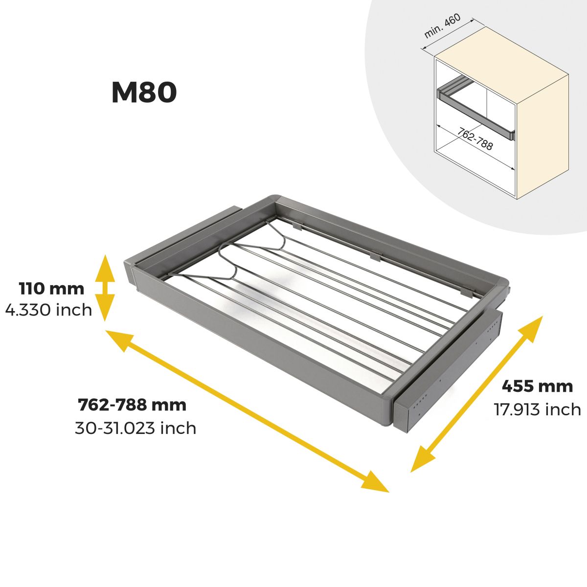 Adatto per uno spazio interno di armadio di 762–788 mm con profondità minima di 460 mm. Ogni guida ha una regolazione fino a 13 mm, garantendo un’installazione perfetta in qualsiasi spazio dell'armadio.