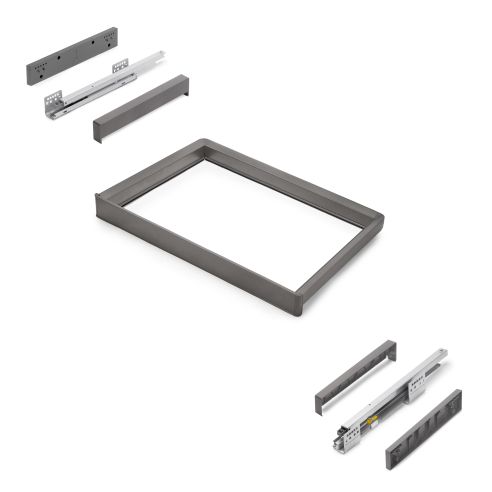 Telaio con chiusura ammortizzata, guide ad estrazione totale che supportano fino a 30 kg di peso, ideali per essere montate insieme agli accessori per armadi Quartz per massimizzare lo spazio di archiviazione nell'armadio.
