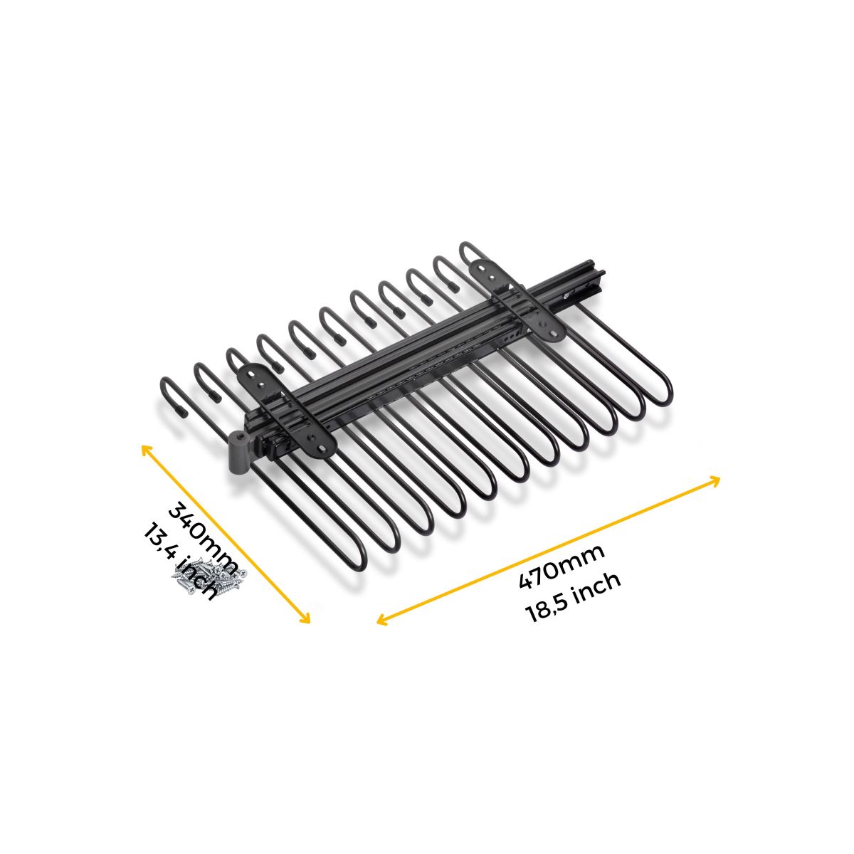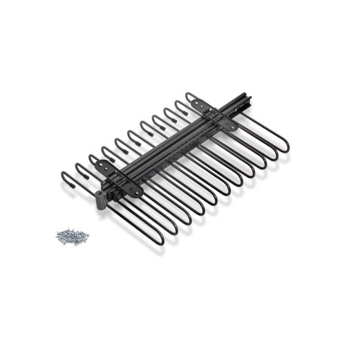 Incorpora 11 aste che consentono di appendere più capi, con elastici antiscivolo che ne impediscono lo spostamento, una maniglia nella parte anteriore per facilitarne l'estrazione e viti per il fissaggio.