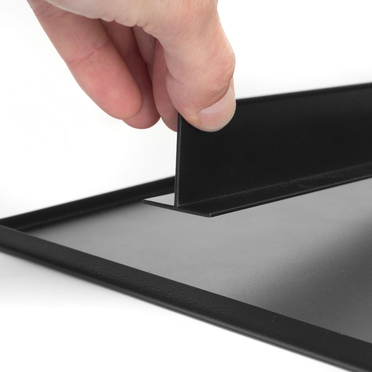 - Vassoio in metallo realizzato in acciaio con finitura verniciata nera testurizzata. È dotato di divisori in acciaio che si fissano al vassoio grazie alla striscia magnetica sulla base.