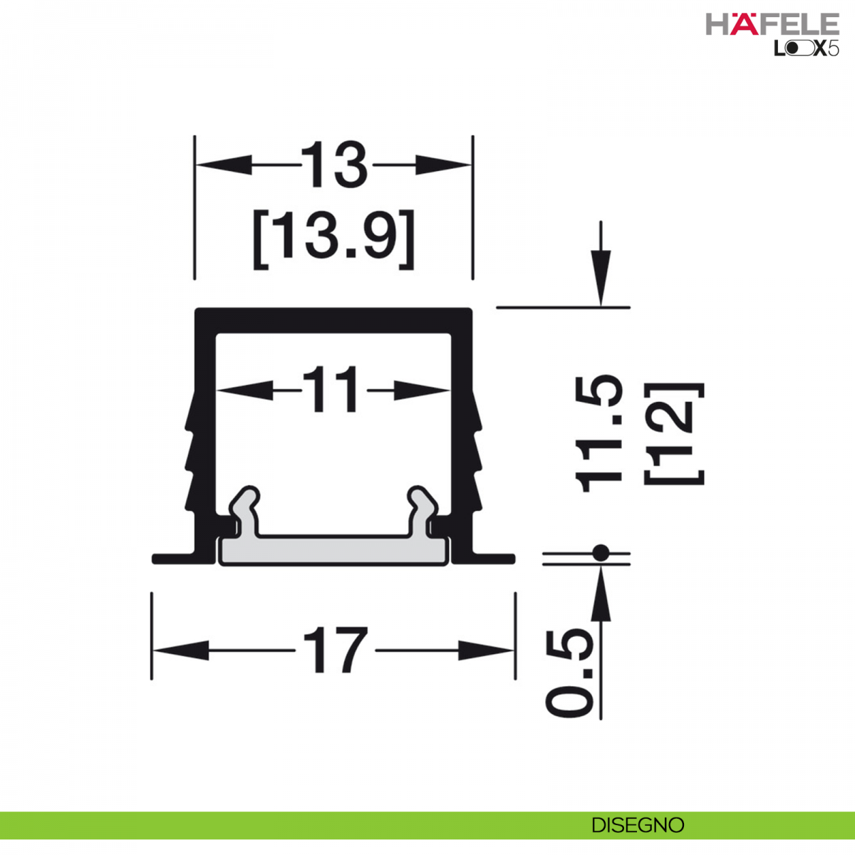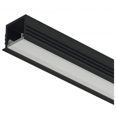 Profilo da incasso in alluminio nero anodizzato per strip LED fino a 8 mm di larghezza Hafele Loox5 modello 1103, con diffusore opale bianco trasmittanza 60-70%, lunghezza 3000 mm.