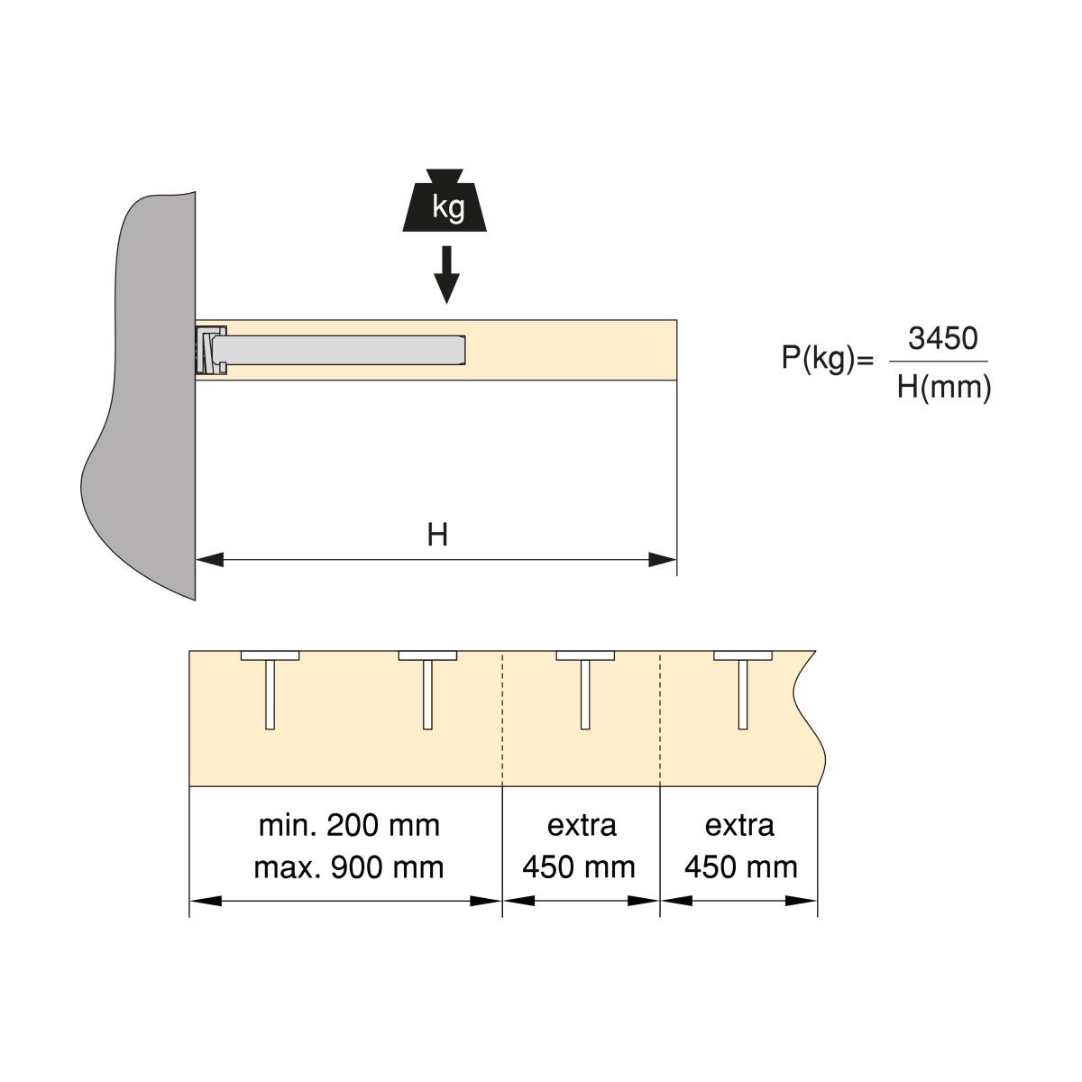 - Sono adatte per uno spessore minimo del pannello di 25 mm, con un peso massimo per 2 staffe (incluso il pannello) di 13,8 kg per scaffali di 900 x 250 mm.