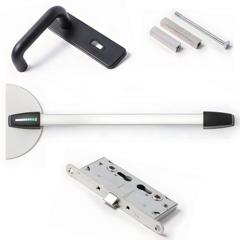 Kit maniglione antipanico Slash Ninz 4204301.036 per porta tagliafuoco anta singola o attiva modello Proget, Univer e Rever, compreso di serratura antipanico entrata 65mm, riscontro serratura in plastica nera, meccanismi in acciaio zincato, carter in plastica nera, barra in alluminio anodizzato con tubo di collegamento, comando esterno in plastica nera, piastra di fissaggio, placca coprifori in plastica colore RAL 9006, mezzocilindro, pittogramma adesivo (freccia verde), istruzioni di montaggio.