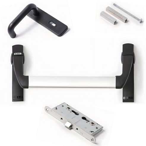Kit maniglione antipanico Twist TW BM Ninz 4204301.031 per porta tagliafuoco anta singola o attiva modello Proget, Univer e Rever, compreso di serratura antipanico entrata 65mm, riscontro serratura in plastica nera, meccanismi in acciaio zincato, carter in plastica nera, bracci in plastica nera con anima in acciaio, barra in alluminio anodizzato, comando esterno in plastica nera, pittogramma adesivo (freccia verde), istruzioni di montaggio.
