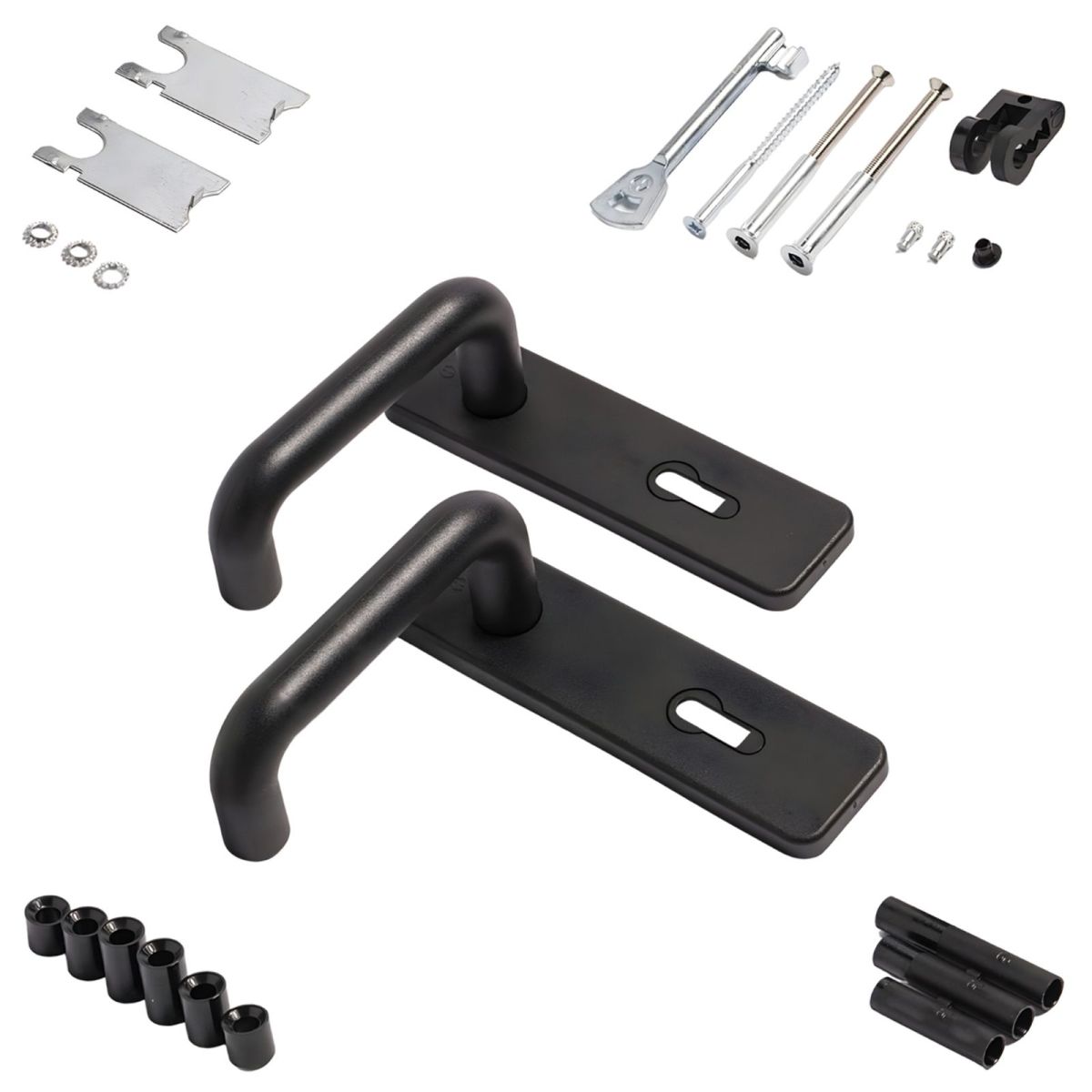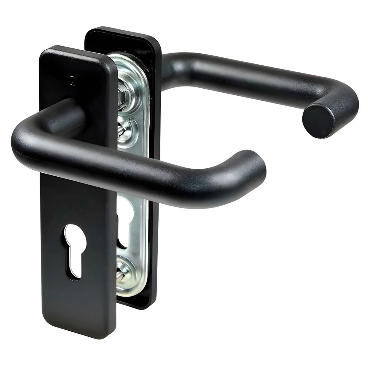 Maniglia M1 Ninz 3201001.024 per porta tagliafuoco ad 1 anta modello Proget e Univer, placca foro patent modificabile per il cilindro europeo, in materiale plastico con anima metallica interna e sottoplacca in acciaio zincato, in finitura nera.