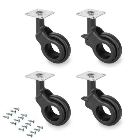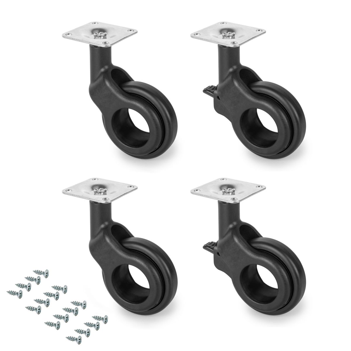 2 ruote senza freno, 2 ruote con freno, viti di fissaggio