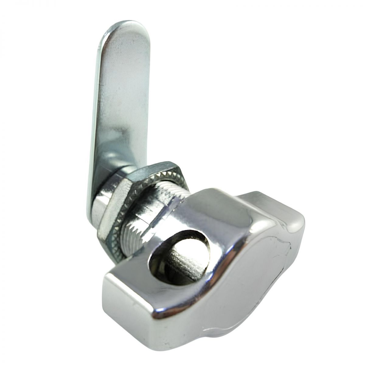 Serratura meccanica universale lucchettabile a levetta per anta Serie 26 Meroni, corpo cilindro diametro Ø16,2 mm lunghezza 20 mm, levetta piana, chiave differente, articolo Meroni 26GPAD, fissaggio con dado, finitura nichelato.
