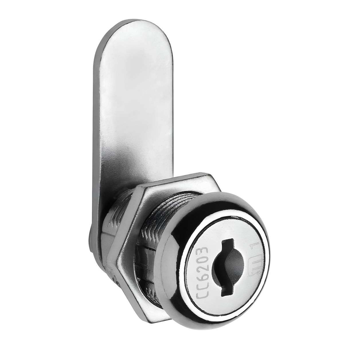 Serratura meccanica universale con cilindro a levetta Serie 26 Meroni, corpo cilindro diametro Ø19 mm lunghezza 20 mm, levetta piana, chiave differente, articolo Meroni 2651, fissaggio con dado, finitura nichelato.