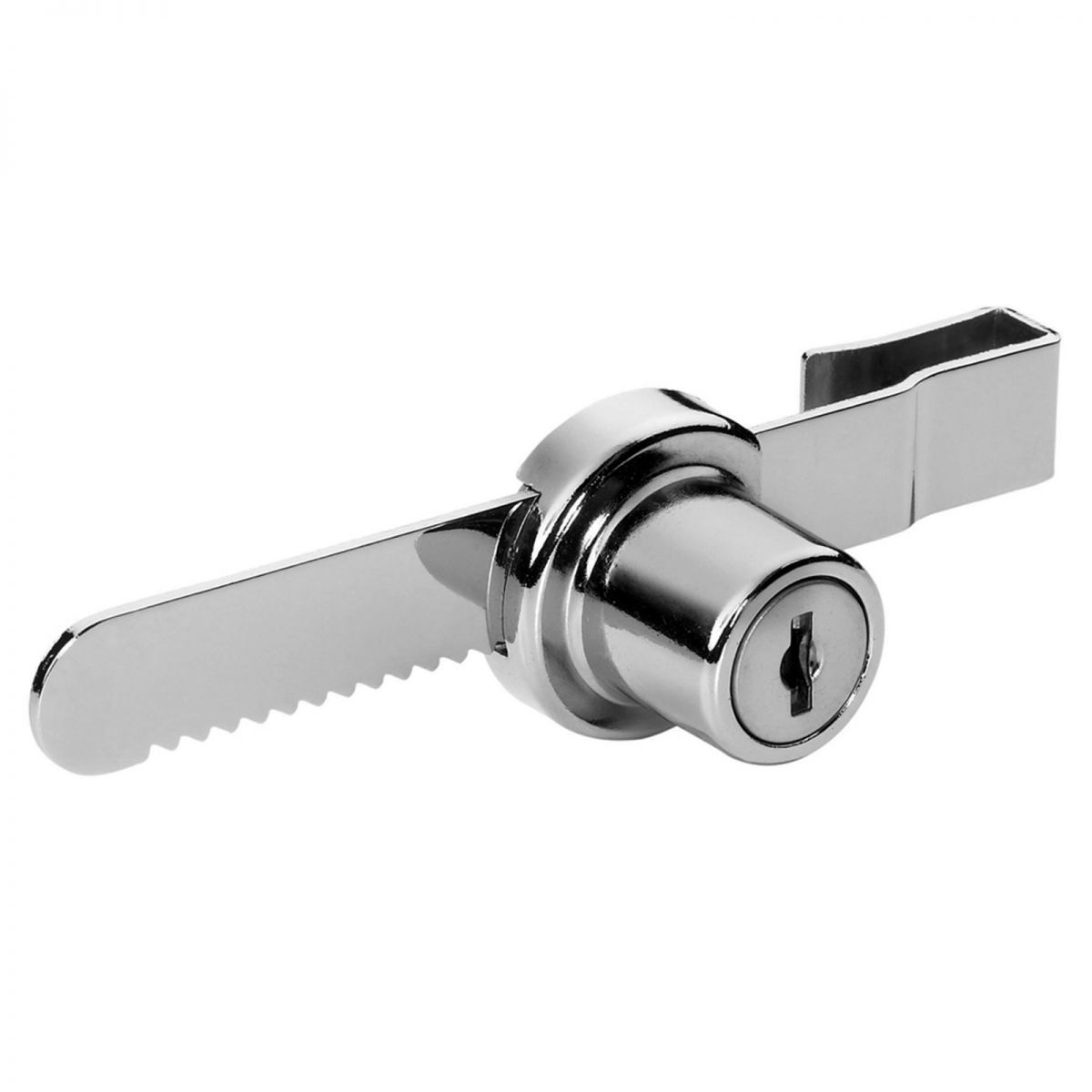 Serratura meccanica a cremagliera per doppia anta in vetro scorrevole Meroni, senza foratura, corpo cilindro diametro Ø21 mm, per applicazione su vetrine e cristalli per spessore fino a 7 mm, chiave differente, articolo Meroni 2910, finitura cromo lucido.