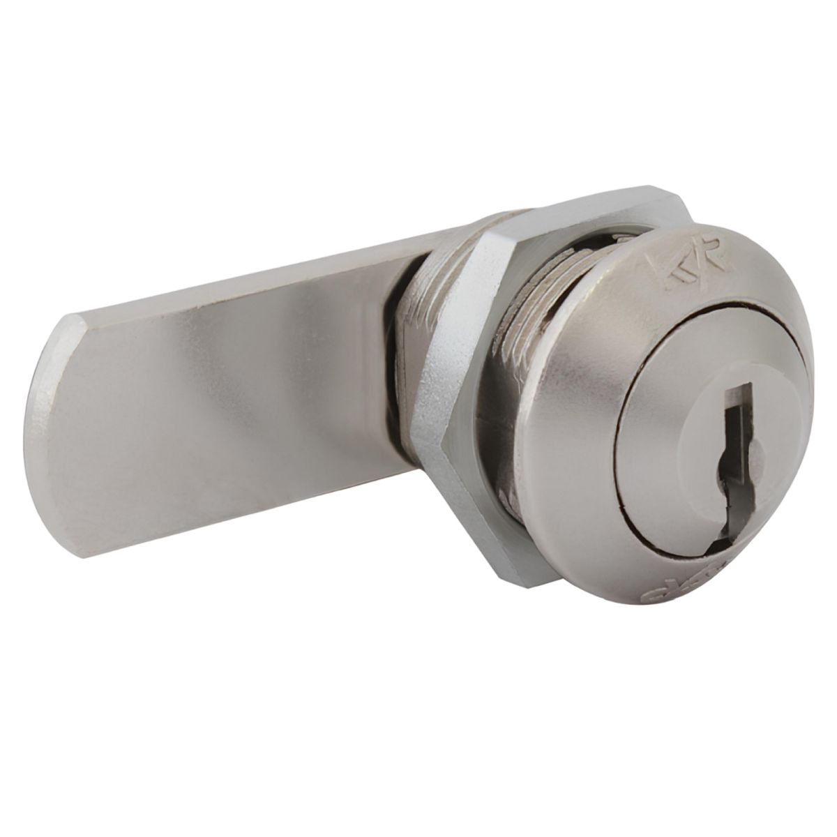 Serratura meccanica universale con cilindro a levetta KYR Securital, corpo cilindro diametro Ø19 mm lunghezza 20 mm, levetta piana, funzionamento 90° destro, chiave differente KD, articolo KYR 19, fissaggio con dado, finitura nichelato.