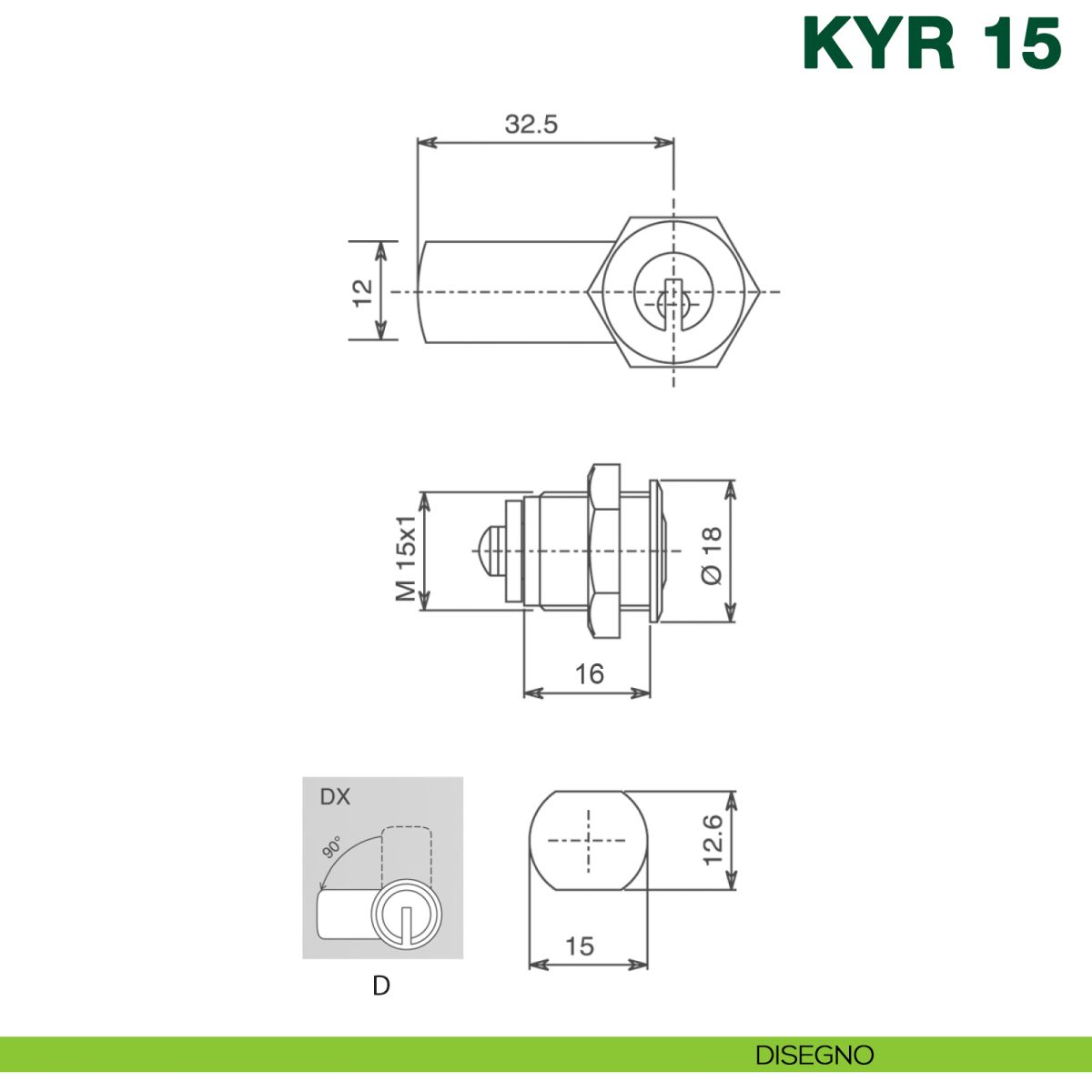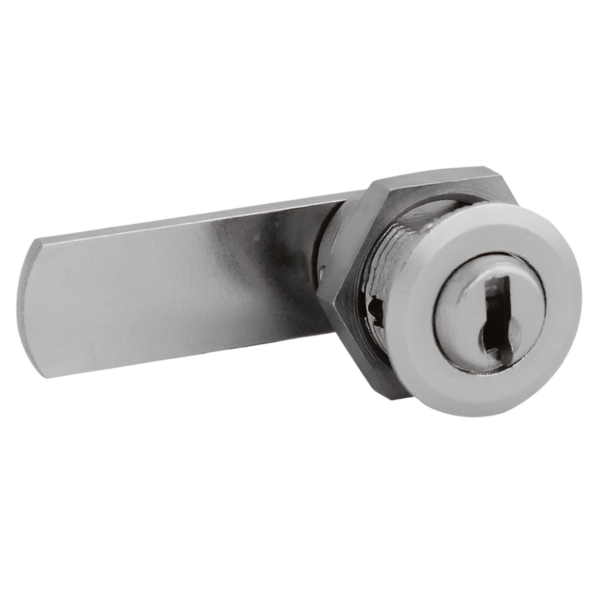 Serratura meccanica universale con cilindro a levetta KYR Securital, corpo cilindro diametro Ø15 mm lunghezza 30 mm, levetta piana, funzionamento 90° destro, chiave differente KD, articolo KYR 15, fissaggio con dado, finitura nichelato.