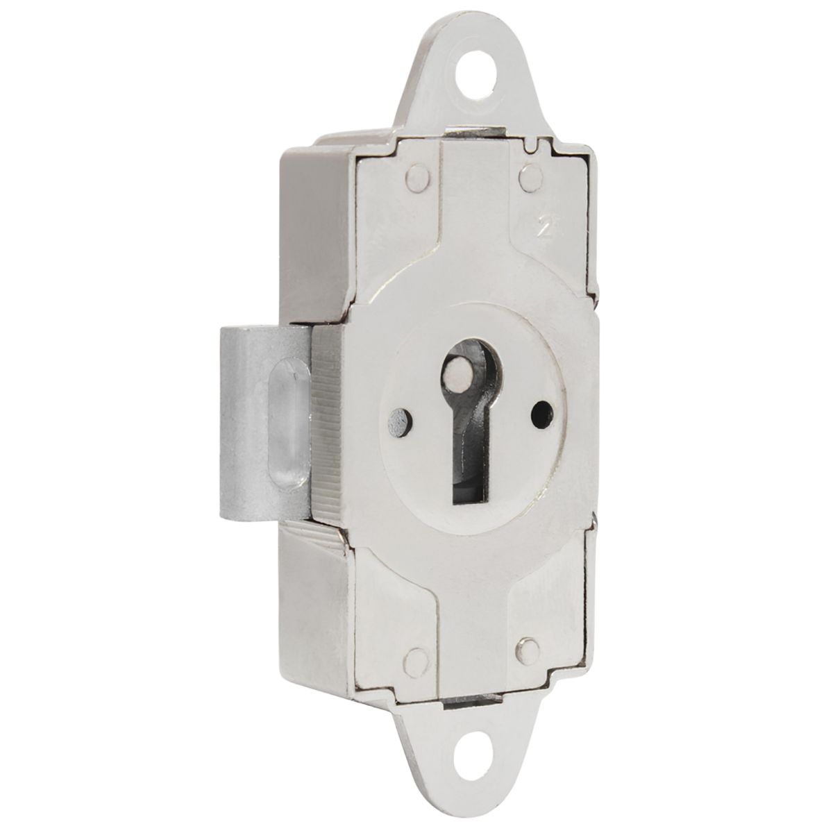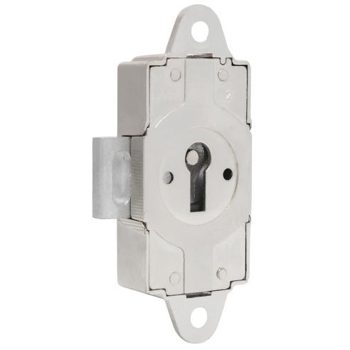 Serratura per armadio ad aste rotanti con cilindro KYR Securital, con catenaccio centrale, corpo cilindro diametro Ø16,5 mm lunghezza 21 mm, chiave differente KD, funzionamento 90° destro, articolo KYR 20C, montaggio da avvitare, finitura nichelato.