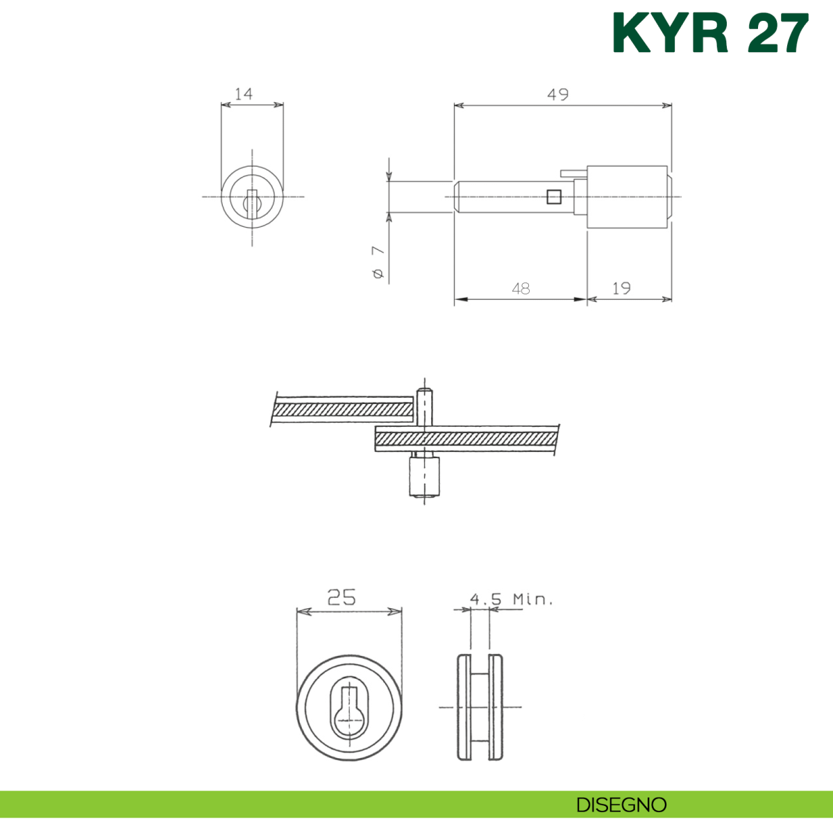 Serratura per scorrevole in vetro con cilindro KYR Securital, corpo cilindro diametro Ø14 mm lunghezza perno 48 mm, funzionamento 90° destro, chiave differente, articolo KYR 27, finitura nichelato.