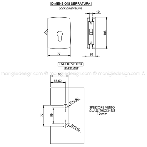 Serratura per porta in vetro foro cilindro con gancio Comit Glass art. SER004GA.