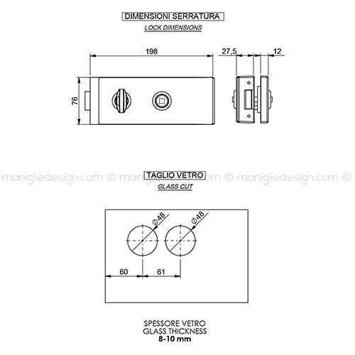 Serratura per porta in vetro foro maniglia con nottolino WC Comit Glass art. SER006WC.
