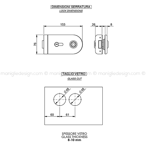 Serratura per porta in vetro foro maniglia con cilindro Comit Glass art. SER007FY.