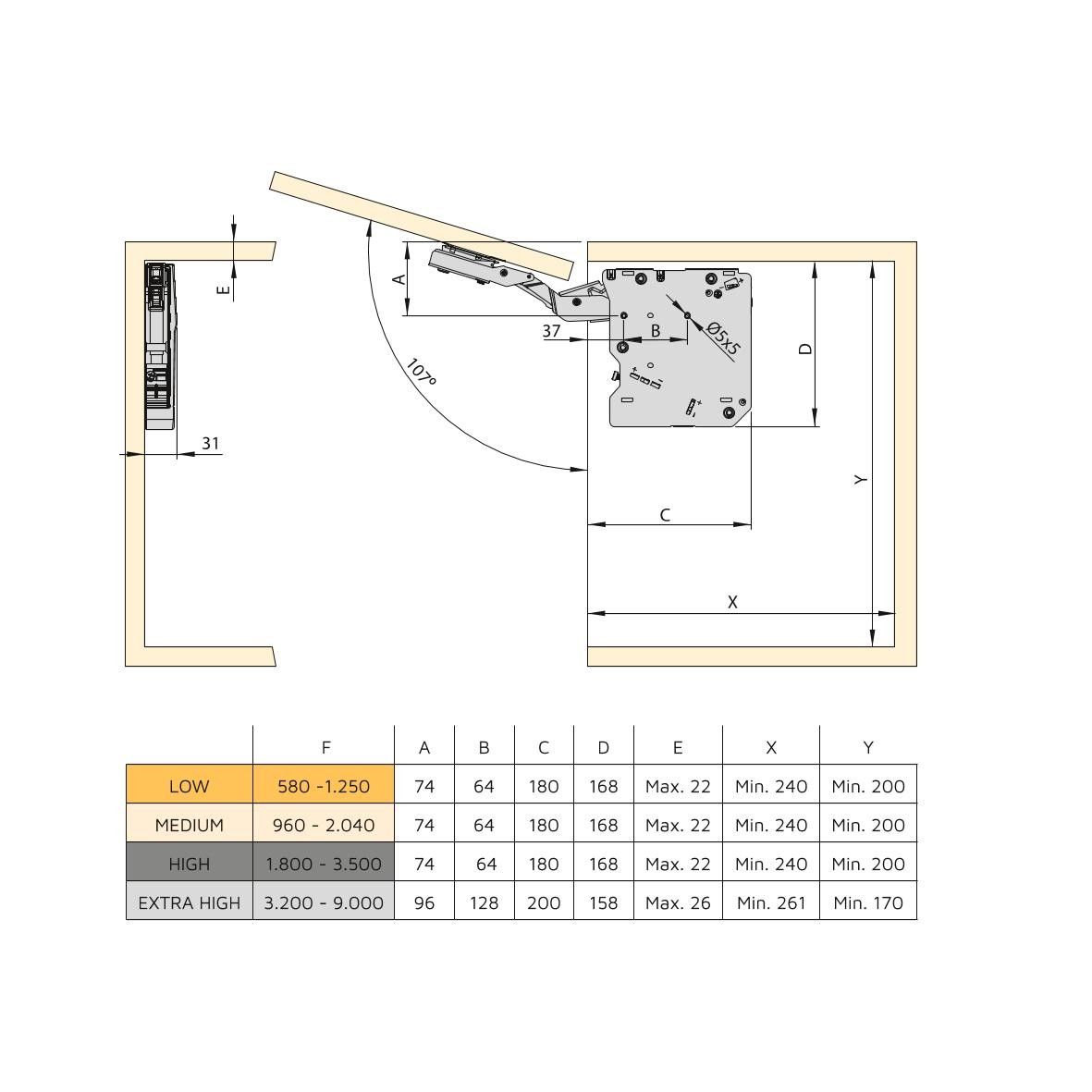 Sistema di braccetti per ante sollevabili nei mobili della cucina e della casa. Si distinguono per il funzionamento regolare e preciso, senza la necessità di cerniere nel montaggio . Non necessita di alcun attrezzo per lo smontaggio dell'anta grazie al suo facile sistema a clip. È stato progettato per una larghezza di modulo fino a 1200 mm e un'altezza tra i 250 e i 500 mm. Permette di regolare la forza del meccanismo, la posizione dell'anta in tre dimensioni ± 2mm e ha una chiusura soft con velocità regolabile.