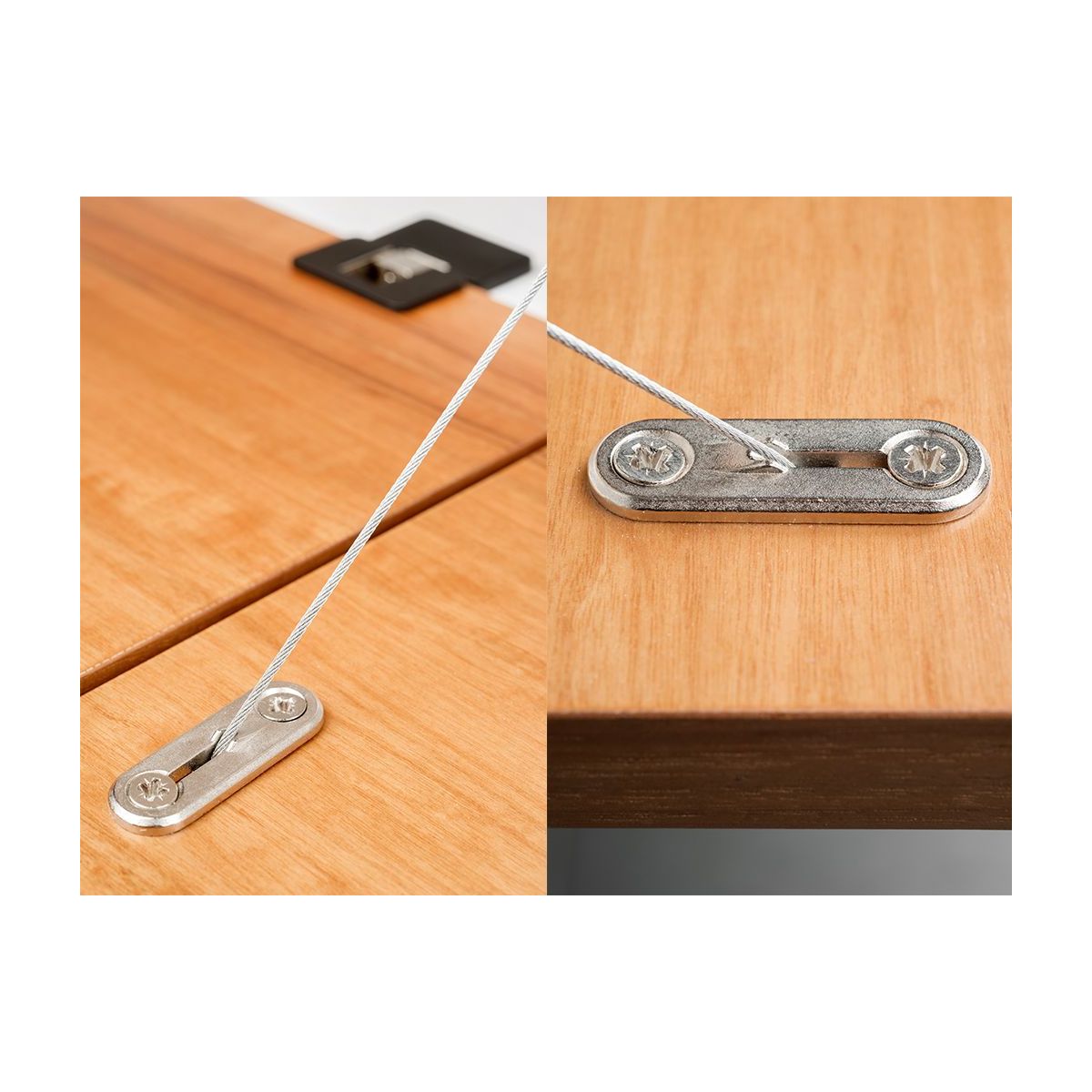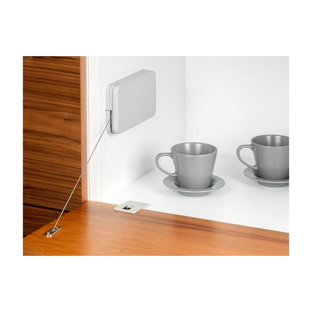 Meccanismo per ante a ribalta con cavo in acciaio. Il meccanismo fornisce una soluzione estetica funzionale e molto innovativa. Ideale per i mobili della cucina e salone.Design molto attento, linee morbide e geometriche. Meccanismo di piccola dimensione e di poco spessore per renderlo meno invasivo nell’insieme del mobile. Con la cover decorativa il risultato finale è molto elegante.Dispone di un’ammortizzazione in apertura dell’anta e di un supporto in chiusura, consentendo di rilasciare l’anta prima di chiuderla, riducendo il colpo della chiusura. Con regolazione dell’effetto frenante e della posizione finale d’apertura.Disponibile in una vasta gamma di forze frenanti, ciò che permette di usare ante da 200 mm a 480 mm di altezza e fino a 14 kg di peso con due meccanismi.Permette il montaggio in due posizioni (verticale e orizzontale). Ciò aiuta a ottimizzare lo spazio in mobili poco profondi.Meccanismo reversibile, può essere montato sia a destra che a sinistra. Include agganci, viti e tappo.
