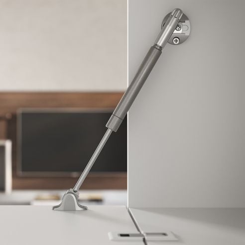 Pistone a gas per l'apertura delle ante a rialza (verso l'alto), anche adiacenti, soft-stop Ferramenta Livenza serie Kraby lunghezza interasse 244 mm. L'anta può essere spinta gradualmente fino alla sua massima apertura.