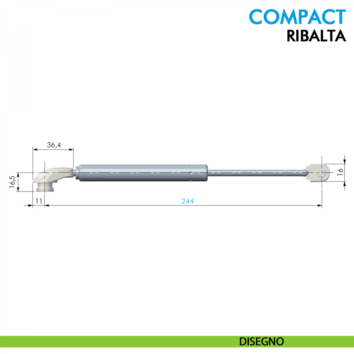 Pistone a gas per l'apertura delle ante a ribalta (verso il basso), apertura ammortizzata Ferramenta Livenza serie Compact lunghezza interasse 244 mm.