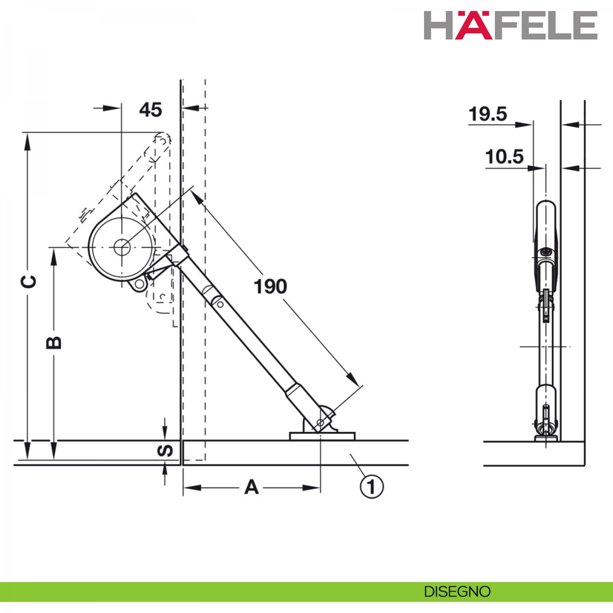 Fermo per piano ribaltabile in legno verso il basso Hafele, con effetto frenante, con elemento di tenuta, utilizzabile sia su lato destro che su lato sinistro.