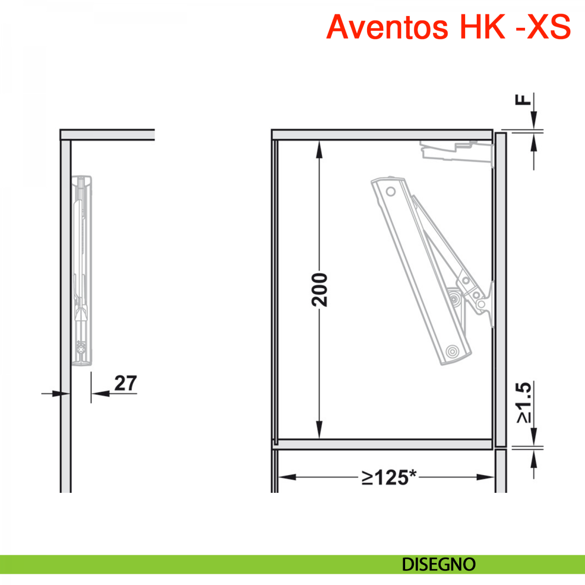 Guarnitura per anta a ribalta Blum Aventos HK-XS, per ante in legno o telai in alluminio larghi e stretti.