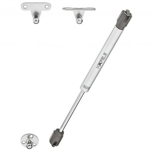 Pistone a gas Hafele per ante a ribalta in legno o con telaio in alluminio, per angolo di apertura 75°/90°/110°, finitura nichelato, fissaggio con viti per truciolare comprese nella guarnitura.