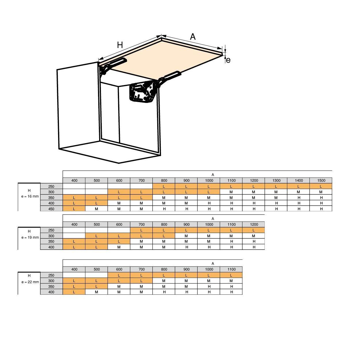 - Modello Low (L), compatibile con porte di altezza compresa tra 250 e 800 mm e tavole di spessore compreso tra 16 e 22 mm. Consultare la tabella di selezione in base all'altezza e alla larghezza della porta per identificare il modello adeguato. Questo modello è progettato per forze richieste comprese tra 560 e 1800, calcolate secondo la formula corrispondente.