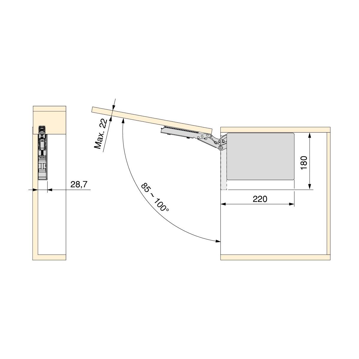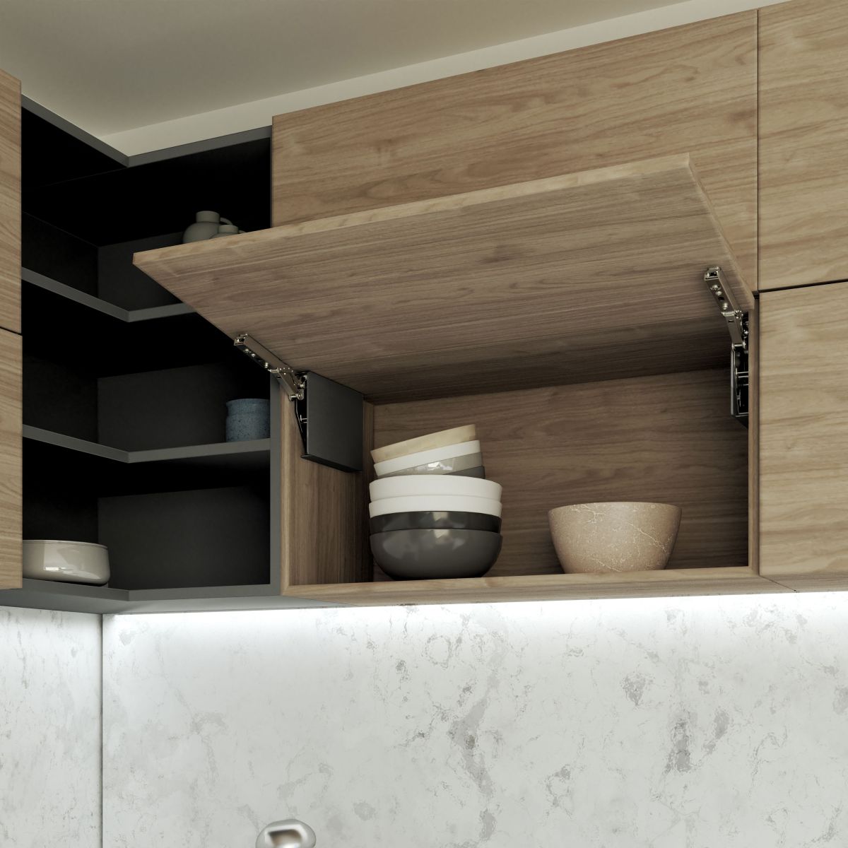 - Sistema di braccetti progettato per ante elevabili senza cerniere, con chiusura soft e smontaggio senza attrezzi grazie al sistema a clip.