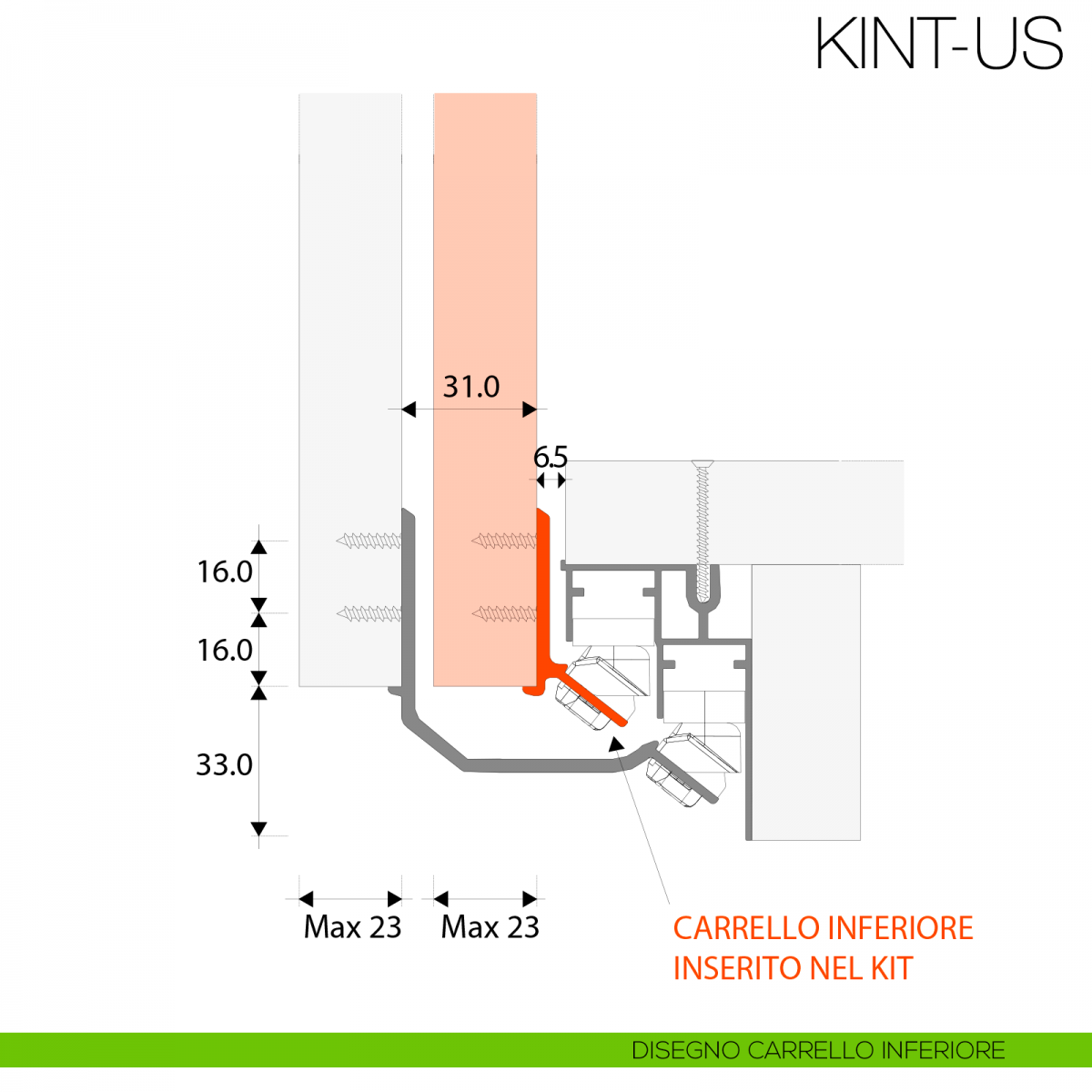 Kit per per anta interna Gap Italia modello Usual per armadi e scorrevoli sovrapposti, portata 100 kg, comprensivo di carrelli superiore H 70 mm, carrelli inferiori H 33 mm da terra e attivatori per fermi.