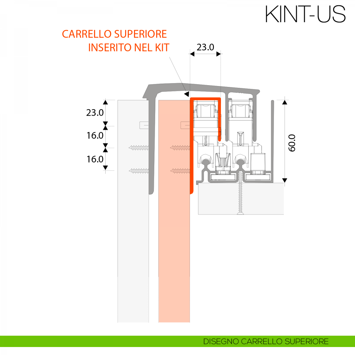 Binario superiore in alluminio con schiena Gap Italia IN 10 per ante scorrevoli, fissaggio ad avvitamento interno.
