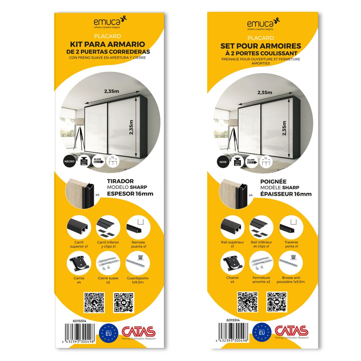 Emuca Kit di ferramenta per armadio 2 ante e chiusura ammortizzata Placard 74, Modello Maniglia Sharp, spessore 16 mm