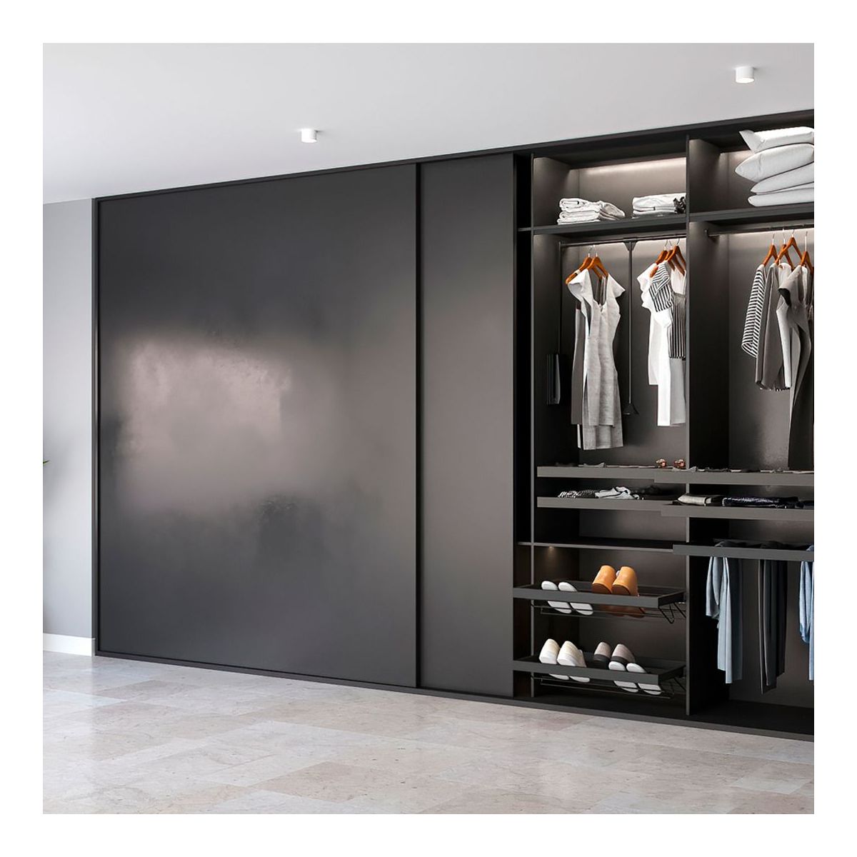 Sistema scorrevole Flow con kit per ante in legno supportate. Questo kit include tutti gli accessori necessari per installare un armadio a 2 ante tranne i pannelli. Il kit comprende 2 dispositivi di chiusura ammortizzata per ogni anta con cui si ottiene una chiusura e un'apertura ammortizzate, progettato per ante fino a 30 Kg. I carrelli sono in acciaio e plastica con ruote dotate di cuscinetti a sfera che fanno scorrere agevolmente il sistema, inoltre questi carrelli hanno un blocco di regolazione che si attiva con la semplice rotazione di una vite oltre ad avere una regolazione in altezza di 6 mm. Il suo montaggio è semplice in quanto la lavorazione da effettuare è la stessa sia nella parte superiore che in quella inferiore del mobile poiché per questo sistema progettato in alluminio viene utilizzata la stessa guida.