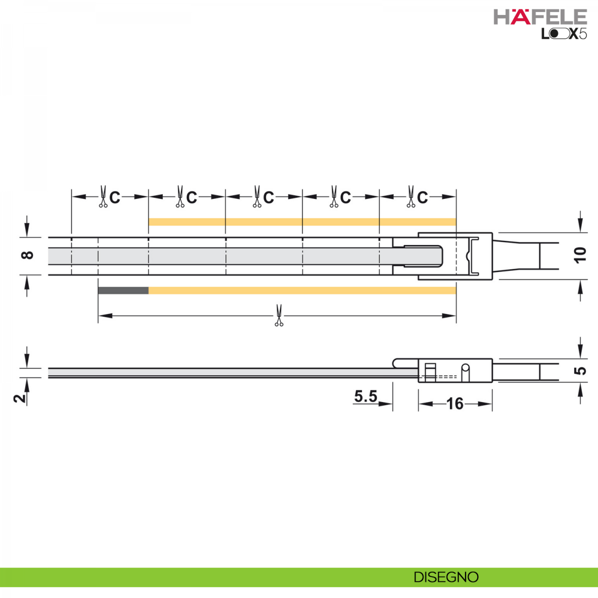 Strip LED COB Hafele Look5 modello 3105, 24 Volt, 8 mm, a 2 poli (monocromatico), 480 LED al metro, 14,4 Watt al metro, illuminazione omogenea, nessun punto LED visibile, angolo di rifrazione di 150°, accorciabile anche tra i segni di taglio, montaggio autoadesivo.
