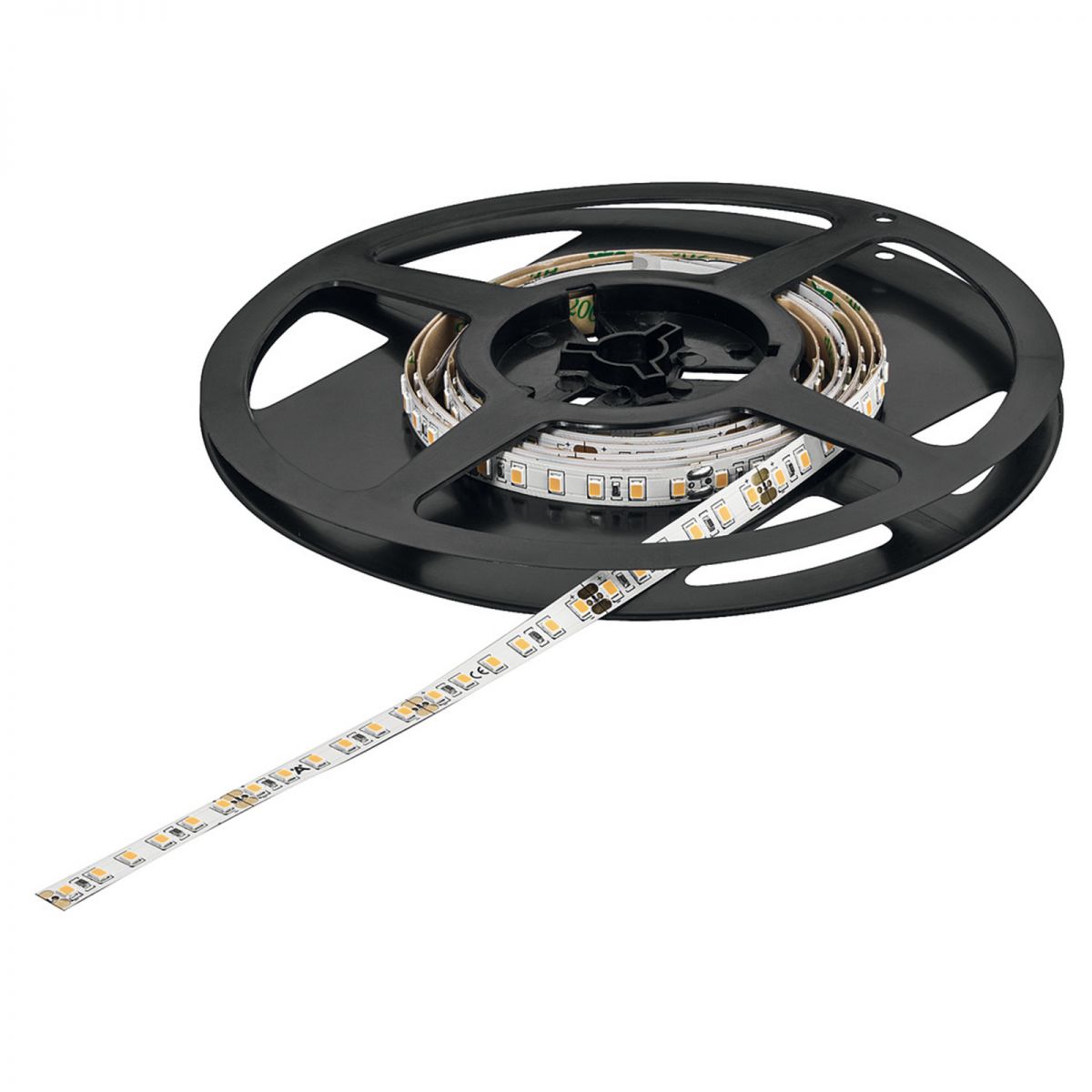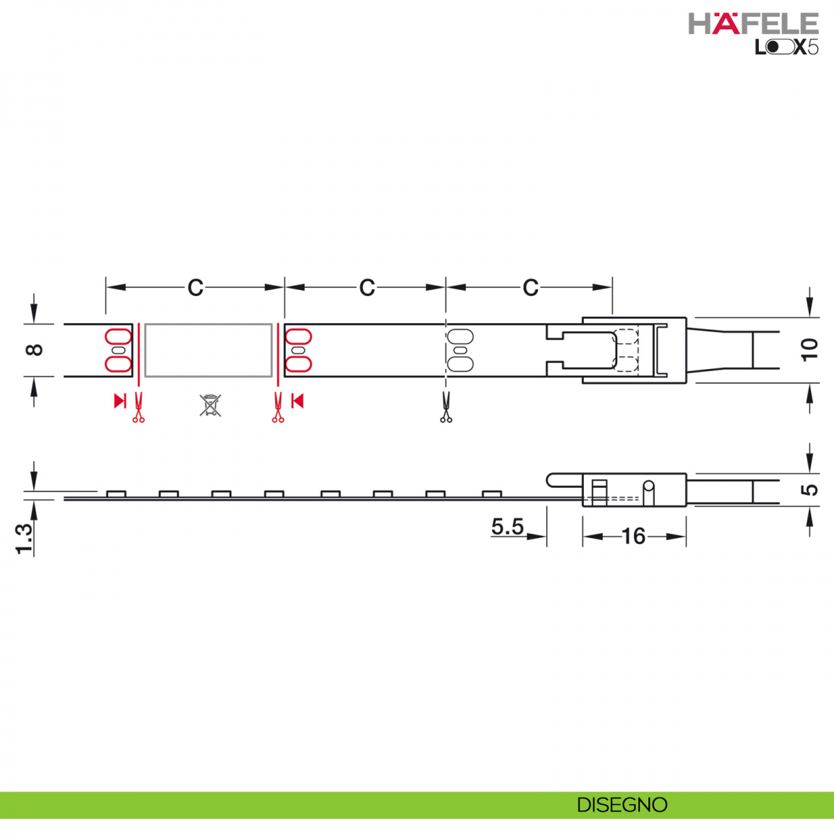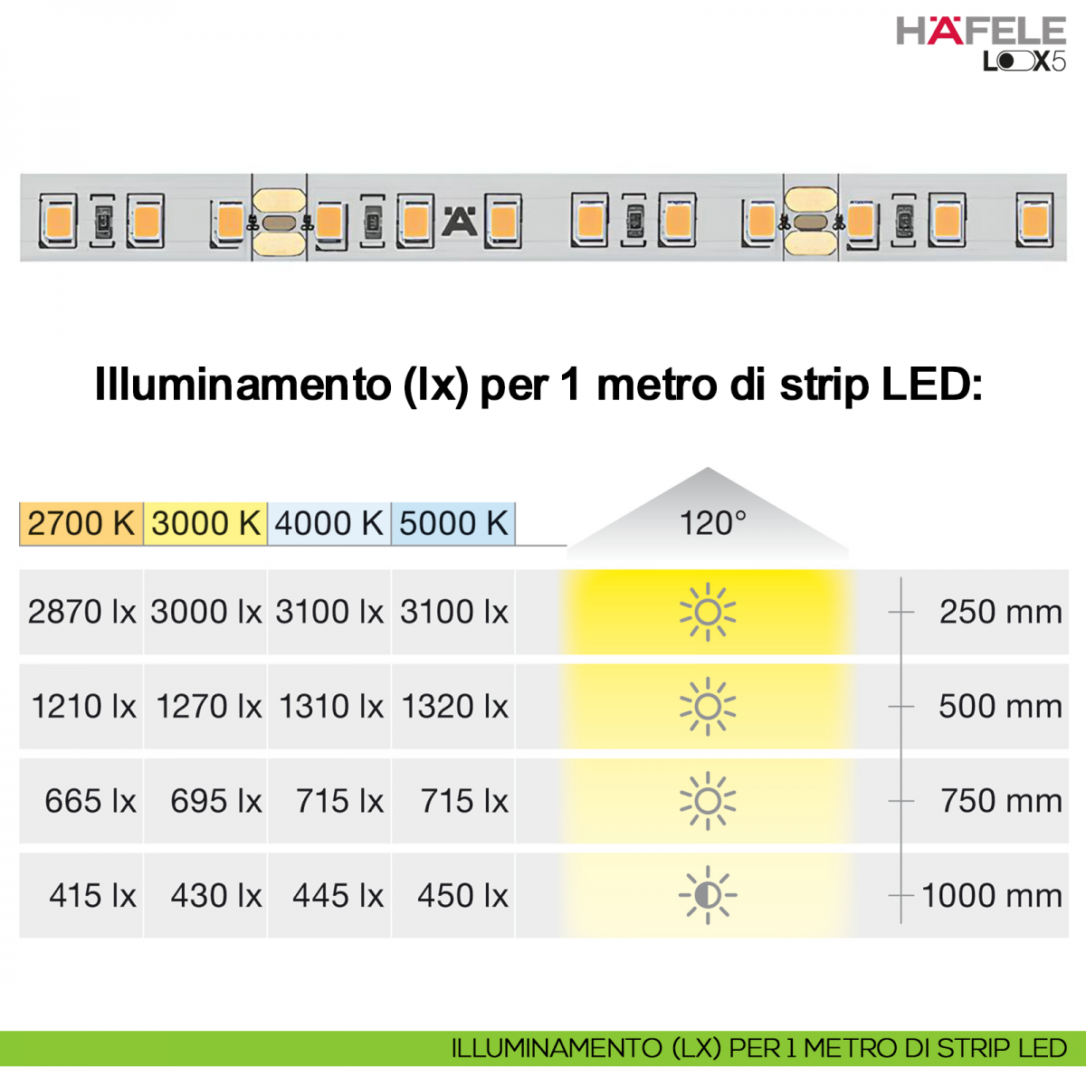 Strip LED Hafele Look5 modello 3048, 24 Volt, 8 mm, a 2 poli (monocromatico), 120 LED al metro, 14,4 Watt al metro, LED Samsung di elevata qualità, montaggio autoadesivo.