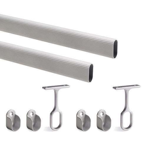 Kit include due tubi per armadio 30x15 mm prodotti in alluminio e i supporti laterali per l'installazione. Il tubo appendiabiti è disponibile in due misure: 750mm e 1150mm. Nei kit da 1150 mm se includono inoltre 2 supporti centrali per fornire maggiore rigidità al tutto. In conformità alla norma ISO: 7170:205, la barra ed i reggitubi possono sostenere un peso massimo di 40 kg/metro uniformemente divisi.