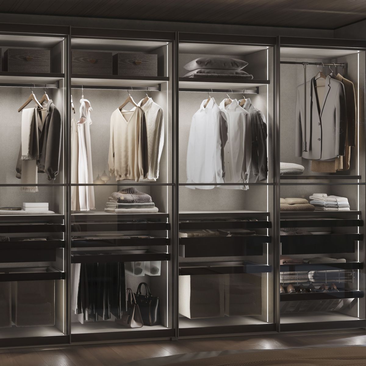 - Kit barra appendiabiti Luxe con illuminazione Neonlynx V 4,5x8 e sensore di movimento RF Smart, progettato per illuminare e organizzare l'interno dell'armadio in modo elegante ed efficiente. Adatto per armadi con larghezza interna di 1.160 mm, può essere facilmente tagliato ogni 25 mm per un adattamento preciso allo spazio disponibile.